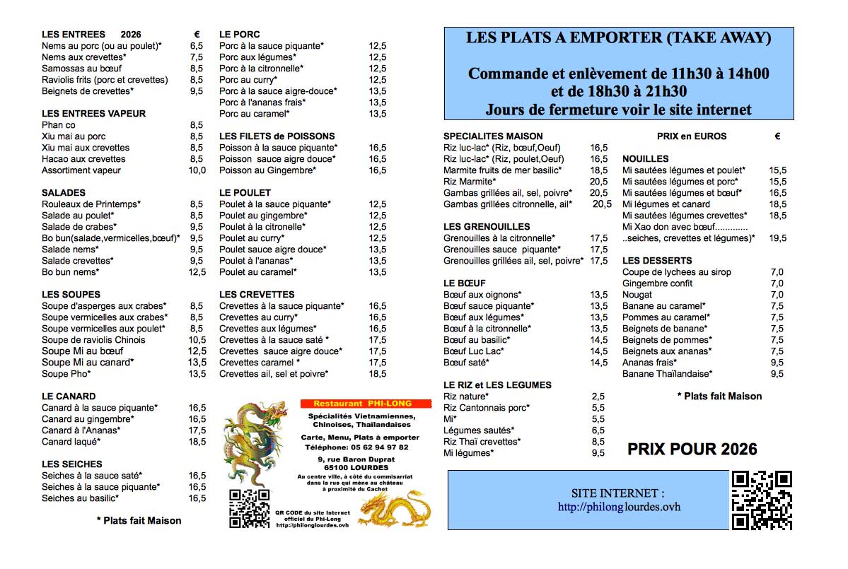 PLATS À EMPORTER et CARTE (Tarifs à partir du 1er janvier 2026, ces tarifs restent valables jusqu'au 30 Juin 2026)